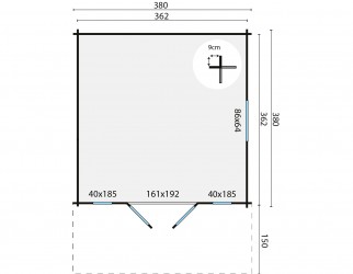 Dimensions au sol : longueur de 3,80 mètres, largeur de 3,80 mètres, hauteur au faitage de 2,77 mètres.