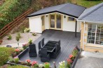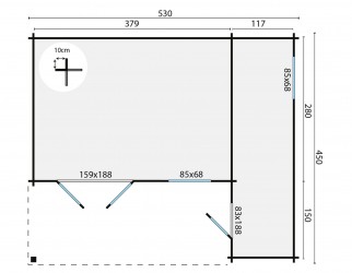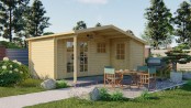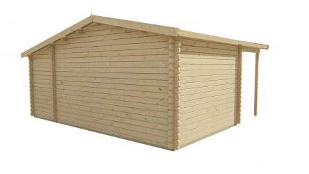 Chalet WOLFGANG en sapin non traité de 10,60 m2 avec annexe de 5,40 m2 et auvent de 5,40 m2.