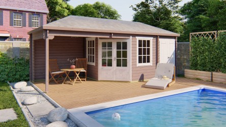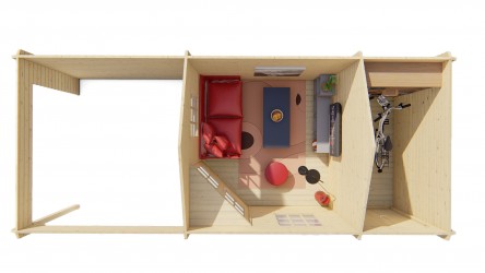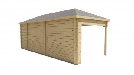 Chalet OLSON en sapin non traité de 7,40 m2 avec annexe de 3,70 m2 et auvent de 7,40 m2 .