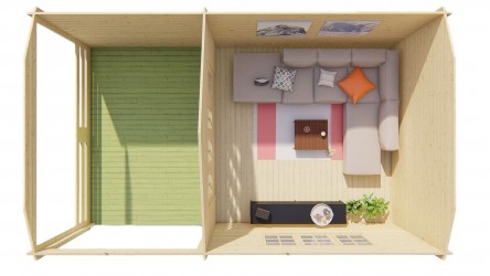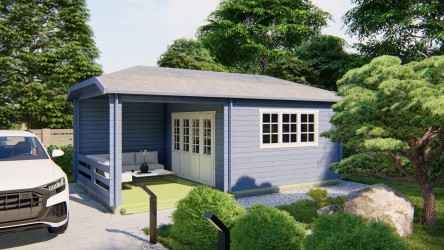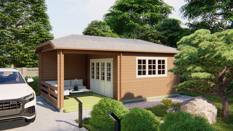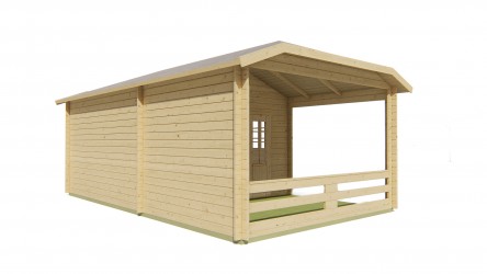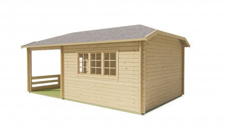 Chalet TORKEL en sapin non traité de 15,30 m2 avec auvent de 10,80 m2.